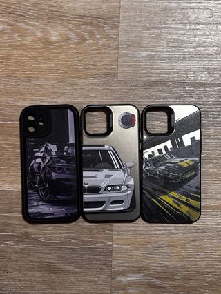Tres fundas para iPhone 12 con diseños de coches. - Diseño de BMW deportivo morado. - Diseño de BMW deportivo blanco. - Diseño de Ford Mustang clásico negro y amarillo.