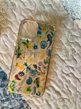 Funda para iPhone 12 con un bonito diseño inspirado en el verano. Protege tu teléfono con estilo. - Diseño con limones, flores y elementos marinos. - Bordes dorados. - Material transparente.