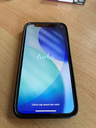 Teléfono iPhone 12. - Pantalla con hola en catalán. - Marco negro.