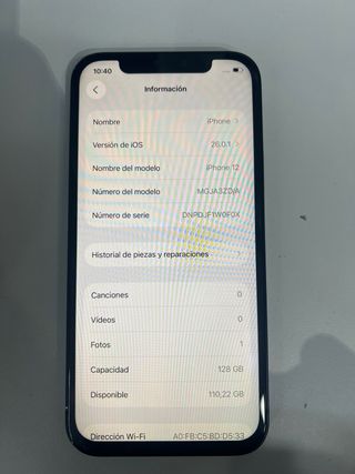 iPhone 12 en perfecto estado, con batería y pantalla recién cambiadas pero no son de origen - Capacidad de 128 GB. - Color rojo. - Capacidad máxima de la batería al 100%. - Carga optimizada activada.