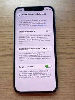 iPhone 12 con 128GB de almacenamiento. La batería se encuentra al 92% de su capacidad máxima. - Capacidad máxima de la batería: 92% - Carga optimizada activada