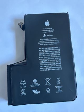 Batería de repuesto para iPhone 12 Pro Max. Original - Capacidad restante: 77% - Modelo: A2466 - Tipo: Li-ion - Voltaje: 3.83V - Energía: 14.13Wh - Fabricada en China