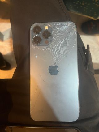 Se vende iPhone 12 Pro Max en color gris plata. El teléfono presenta daños en la pantalla y la parte trasera. - Pantalla agrietada. - Parte trasera rota.