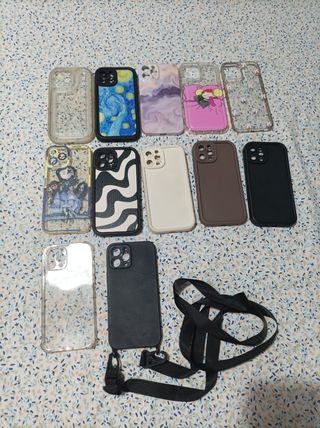 Variedad de fundas para iPhone 12 Pro en perfecto estado. - Incluye 10 fundas con diferentes diseños y estilos. - Fundas de silicona, plástico y diseños estampados. - Algunas incluyen bolsillo o correa. - Precio por unidad