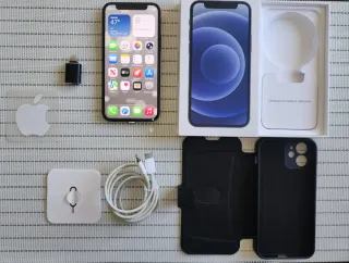Teléfono móvil Apple iPhone 12 mini en color azul oscuro. - Pantalla de 5.4 pulgadas. - Cámara dual de 12 MP. - Chip A14 Bionic. - Incluye cable de carga USB-C a Lightning. - Funda tipo libro negra. - Adaptador Lightning a 3.5mm.