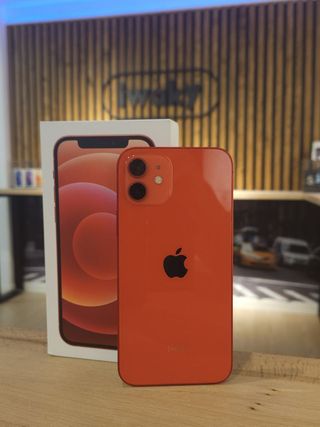 Iphone 12 Red Product de 64GB. Lo compre yo nuevo y todas las piezas son originales, no le he cambiado nada. La batería esta al 79%, sigue durando todo el día. Tiene marcas laterales, las que se ven en las fotos, pero la pantalla, las cámaras y el cristal trasero están en muy buen estado. Incluyo la caja y el cable de carga original, así como el pincho de la SIM.