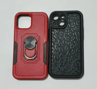 Dos fundas protectoras para iPhone 13 mini. - Funda roja con soporte giratorio. - Funda negra con diseño de leopardo.
