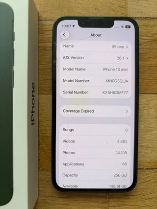 iPhone 13 mini con 256 GB de capacidad. - Modelo: MLK53B/A - Número de serie: VMXYX33WVF - Versión de iOS: 16.1 - Dirección Wi-Fi: A0:4E:CF:41:A8:DC - Bluetooth: A0:4E:CF:37:54:F6 - Firmware del módem: 2.12.02 Salud Bateria 85%. Presenta algunas ralladas en pantalla superficiales. Y desgaste lateral golpe pequeño. Todas las piezas originales. Caja original