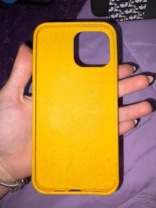 Funda para iPhone 13 Pro Max en color amarillo. - Material compostable. - Diseño con pequeños puntos oscuros. - Logo de la marca grabado en la parte inferior.