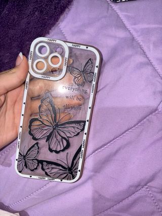 Funda protectora para iPhone 13 Pro Max con un diseño de mariposas y la frase everything will be all right. - Diseño transparente con mariposas. - Mensaje inspirador. - Bordes con estampado HAPPY.