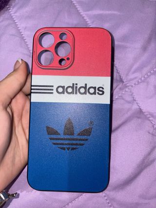 Funda para iPhone 13 Pro Max con diseño deportivo. - Parte superior en color rojo. - Banda central blanca con logo de Adidas. - Parte inferior en color azul. - Logo de Adidas Trefoil en la parte inferior.