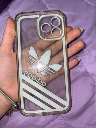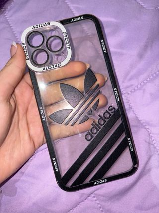 Funda protectora transparente para iPhone 13 Pro Max con diseño de Adidas. - Logo de Adidas en el centro. - Bandas laterales con el logo de Adidas. - Protección para la cámara.