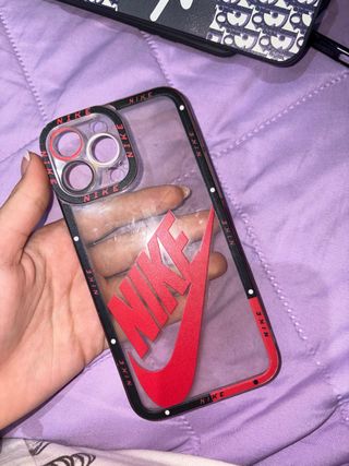 Funda transparente para iPhone 13 Pro Max con diseño de Nike. - Logo de Nike en color rojo. - Borde negro con texto NIKE repetido. - Diseño con protección para la cámara.