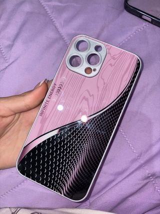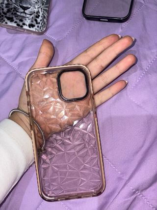 Funda protectora para iPhone 13 Pro Max con un diseño texturizado. - Diseño geométrico en relieve. - Material transparente con borde rosado.