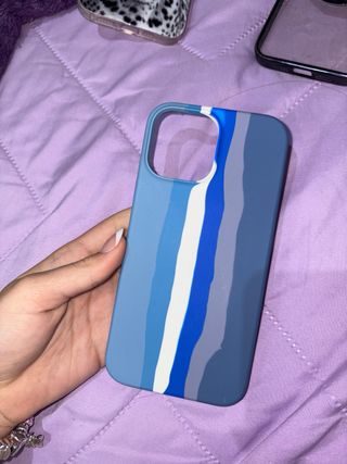 Funda para iPhone 13 Pro Max con un diseño de rayas verticales en tonos azules y blanco. - Diseño de rayas verticales. - Tonos azules y blanco.