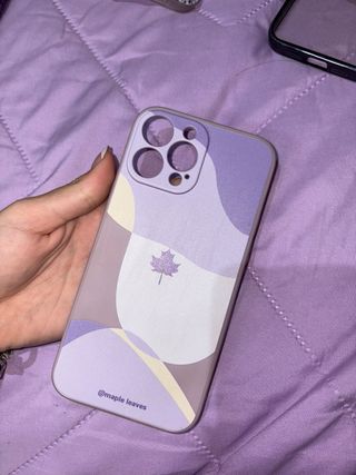 Funda para iPhone 13 Pro Max con un diseño abstracto en tonos morados y un detalle de hoja. - Diseño de formas orgánicas en morado y blanco. - Pequeño grabado de una hoja de arce. - Texto @maple leaves en la parte inferior.