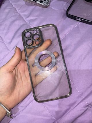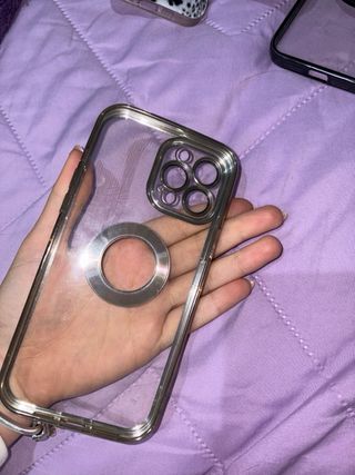 Funda protectora transparente para iPhone 13 Pro Max con aro. - Material: TPU flexible y policarbonato. - Diseño: Transparente con borde plateado. - Funcionalidad: Incluye aro para soporte y agarre.