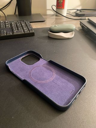 Preciosa funda Hama para iPhone 13 Pro Max, color azul marino. Se encuentra en buen estado, aunque presenta algunas pequeñas marcas de uso. - Funda de cuero sintético. - Diseño elegante y discreto. - Compatible con carga inalámbrica.