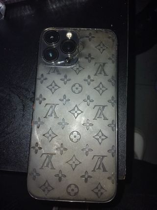 iPhone 13 Pro Max con 256GB de almacenamiento en color gris. El teléfono tiene un diseño con el patrón Louis Vuitton. - Capacidad: 256GB - Color: Gris - Diseño: Estampado Louis Vuitton