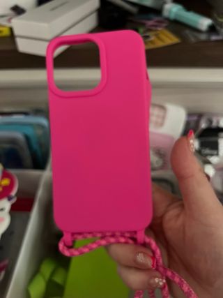 Funda protectora para iPhone 13 Pro en color rosa vibrante. Incluye una cuerda para llevarla cómodamente. - Material de silicona suave al tacto. - Diseño moderno con cuerda integrada. - Acceso a todos los puertos y botones.