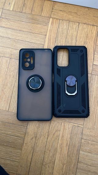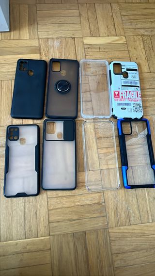 Conjunto de siete fundas protectoras para teléfonos móviles. - Funda negra mate. - Funda negra con anillo. - Funda transparente. - Funda blanca con diseño 'FRAGILE'. - Funda transparente con borde negro. - Funda transparente con tapa para cámara. - Funda con borde azul y negro. (10€ cada una) -Conjunto de 2 fundas de Xiaomi Note 10 Pro Max. (5€ cada una) - Conjunto de 3 fundas de Samsung A53 -Azul cielo -transparentes con los bordes negro/dorado -negro clasico (5€ cada uno) -Conjunto de 8/5/5 (fundas de Samsung A21S) (5€ cada uno) - Conjunto de 4/5/5/5 (fundas del Iphone 13) (9,50€ cada uno)