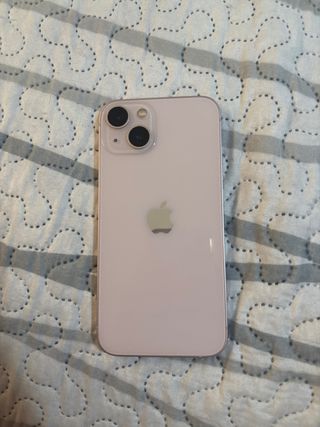 Teléfono móvil iPhone 13 en color rosa. Incluye algunos accesorios: - Auriculares de Apple blancos con conector lightning. - Cable de carga blanco lighting a USB tipo C - Fundas de diversos colores. Está en muy buen estado y funciona a la perfección. La pantalla no tiene desperfectos. Tiene una abolladura en la parte superior que al ponerle una funda no se ve. Batería al 84% de capacidad (dura el día entero sin problemas, e incluso más).
