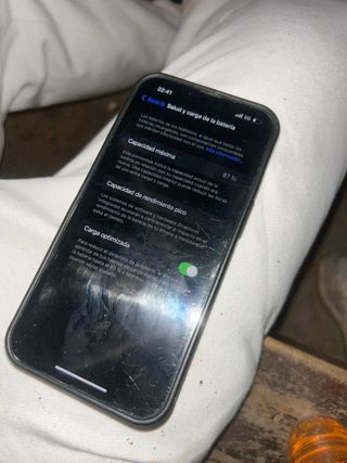 iPhone 13 en color blanco con una capacidad máxima de batería del 87%.con desgastes y arañazos en la parte delantera y la trasera lo que se ve funciona peefectamente - Capacidad máxima de la batería: 87% - Carga optimizada activada.con funda
