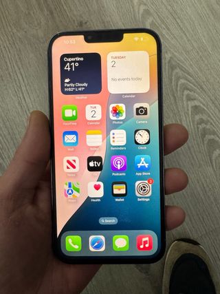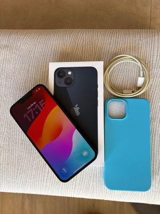 Teléfono móvil iPhone 13 con acabado en color azul. Siempre con funda y cristal templado. Cable de carga sin estrenar. Se vende por cambio de telélefono. - Capacidad de almacenamiento de 128GB. - Salud de la batería 75%.