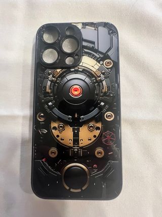 Preciosa funda para iPhone con un diseño mecánico único. Es de color negro con detalles dorados. - Diseño mecánico detallado. - Ajuste perfecto para iPhone. 13 pro - Material resistente. (de cristal)