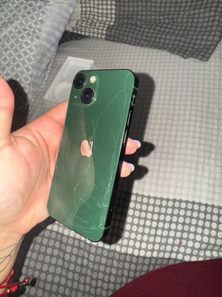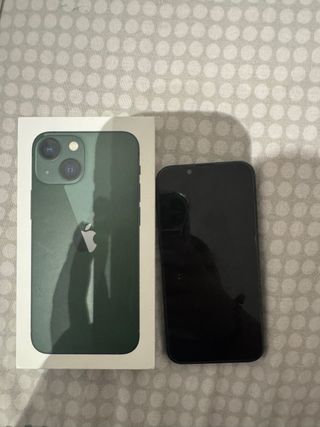 Teléfono móvil iPhone 13 mini en color verde. - Capacidad de almacenamiento de 128 GB. Esta roto por detras pero no altera su funcionamiento. Se puede cambiar Se entrega solo con caja NO CAMBIOS
