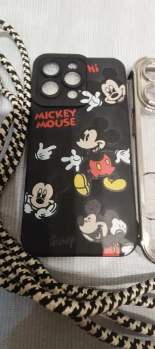 Tres fundas para iPhone 13 Pro con diseños de Mickey Mouse. Incluye una funda transparente con Mickey, una negra con varios Mickeys y una blanca con lunares negros. - Funda transparente con Mickey Mouse. - Funda negra con estampado de Mickey Mouse. - Funda blanca con lunares negros. - Incluye cordón para colgar.