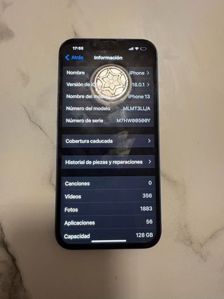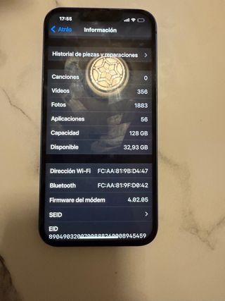 Teléfono móvil iPhone 13 con capacidad de almacenamiento de 128 GB. - Capacidad total: 128 GB - Espacio disponible: 32,93 GB - Número de vídeos: 356 - Número de fotos: 1883 - Número de aplicaciones: 56 - Firmware del módem: 4.02.05