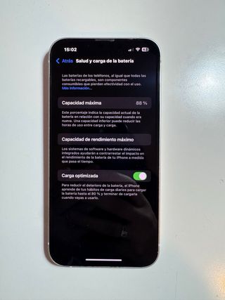 Teléfono móvil iPhone 13. - Pantalla de 6.1 pulgadas. - Cámara dual de 12 MP. - Chip A15 Bionic. - Bateria: 77%, se tendria que cambiar, aunque el móvil carga y aguanta bien. - Nunca cambiada ninguna pieza. - No esta rota la pantalla, es el protector.