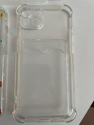 Dos fundas transparentes para iPhone 13. Una con estampado floral y otra con bolsillo para tarjetas. Incluyo tres protectores de cristal. Están en buen estado. - 2 fundas para iPhone 13 - 1 funda con diseño floral - 1 funda con bolsillo - 3 protectores de cristal