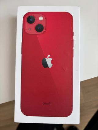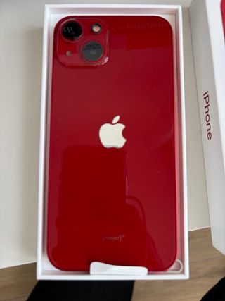 Teléfono móvil iPhone 13 en color rojo. Llevado siempre con funda, aunque tiene algún detalle de uso como se ve en las fotos. tiene cristal delantero adicional protector y también en los objetivos de la cámara. batería al 80%