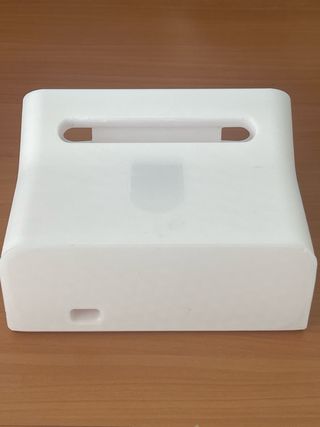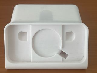 Soporte blanco impreso en 3D para el iPhone 13. Su diseño permite colocar el teléfono en posición horizontal . - Material: Plástico blanco. - Diseño minimalista.