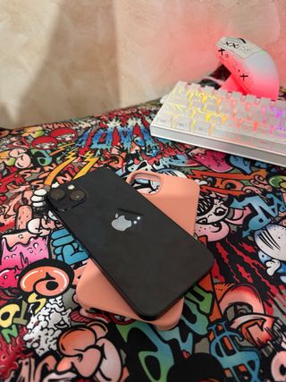 Teléfono móvil iPhone 13 en color negro, acompañado de una funda en color rosa. 93 batería 128 gb esta como nuevo nunca ha reparado - Diseño elegante y moderno. - Acabado mate en la funda.