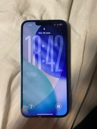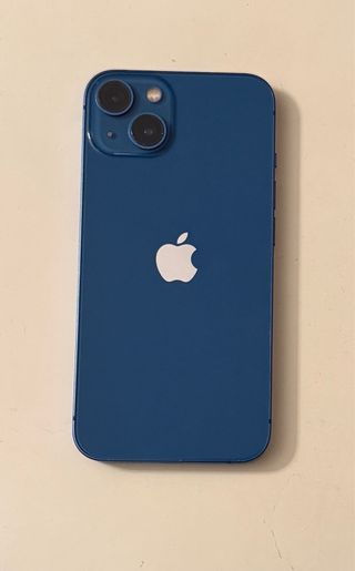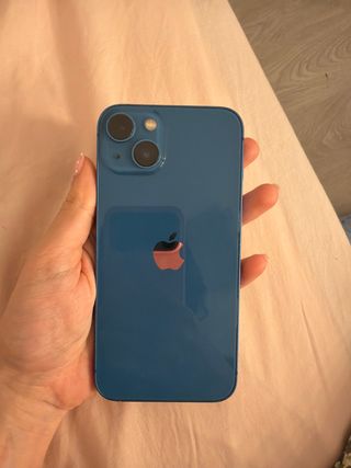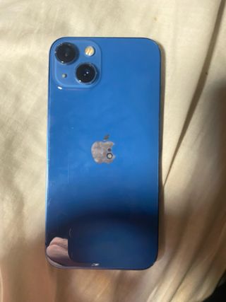 Teléfono móvil iPhone 13 en color azul. - Pantalla de 6.1 pulgadas. - Capacidad de almacenamiento de 128 GB. - El único pero es que la batería se recomendaría cambiar (oficial 95€). Pero igualmente funciona correctamente y aguanta casi todo el día sin mucho uso. Solo con este cambio ya sería un móvil nuevo. - Viene con caja original y cable original, 6 fundas, protector pantalla oscuro (uno puesto y otro a estrenar).