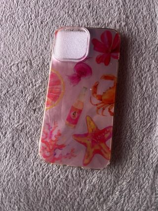Funda para iPhone 13 Pro Max de silicona transparente con diseño colorido de temática marina (estrella de mar, cangrejo, coral, flores, etc.). En buen estado, con signos normales de uso. Protege el móvil de golpes y arañazos. Ligera, flexible y con buen ajuste, acceso a todos los botones y cámara. - Diseño con motivos marinos y cítricos. - Material transparente que deja ver el color original del teléfono.