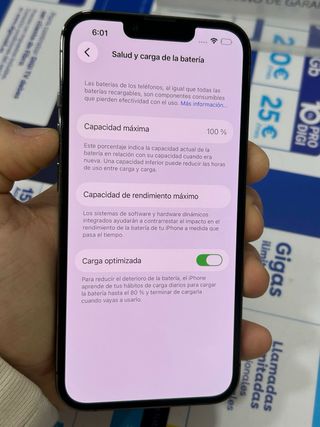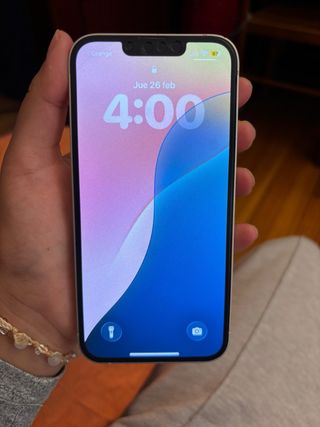 IPhone 13 con 80% de capacidad máxima de batería. Teléfono en perfecto estado salvo 2 marquitas en 1 esquina, por lo demás, no tiene rayas ni en la pantalla ni en el cristal trasero.