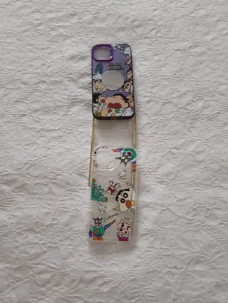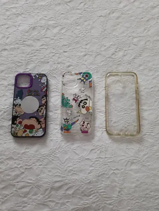 Lote de tres fundas para iPhone 13 con diseños de Crayon Shin-chan. - Funda morada con espejo y personajes. - Funda transparente con varios dibujos de Shin-chan y amigos. - Diseño divertido y colorido.