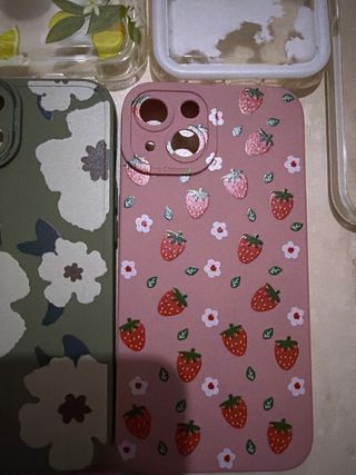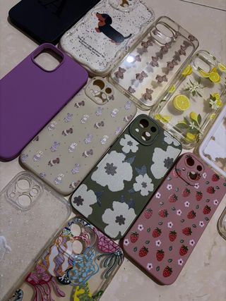 Lote de fundas para iPhone 13 con diferentes diseños. PRECIO SE HABLA POR PRIVADO !! - Funda morada lisa. - Funda beige con perros. - Funda transparente con ositos. - Funda transparente con limones. - Funda verde con flores. - Funda rosa con fresas. - Funda transparente con medusas. - Funda negra.