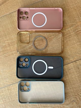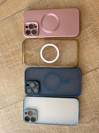Conjunto de fundas para iPhone 13 Pro Max con MagSafe. - Funda rosa metálica con Magsafe - Funda transparente con Magsafe - Funda azul oscuro con Magsafe - Funda azul claro translúcida. Solo se ha usado la transparente
