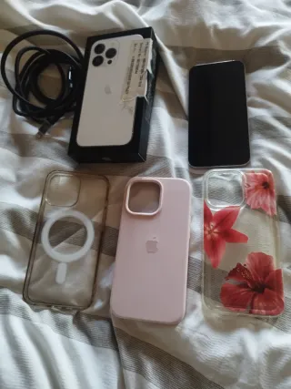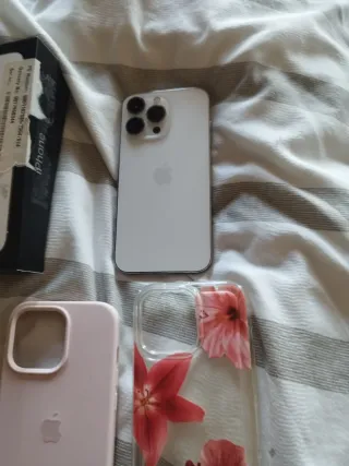 Se vende iPhone 13 Pro en excelente estado, junto con varios accesorios. - iPhone 13 Pro en color blanco/ - Cable de carga reforzado y digital - Funda transparente con MagSafe. - Funda rosa de silicona. - Funda transparente con diseño floral. Batería con 85%