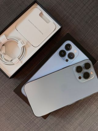 Teléfono móvil iPhone 13 Pro Max en color azul. Una única propietaria. - Incluye 3 protectores de pantalla. - Incluye 3 carcasas. - Incluye cargador. - Pantalla sin arañazos.