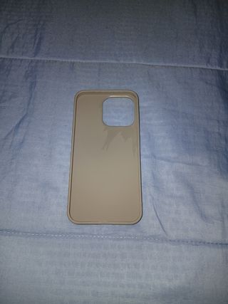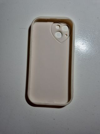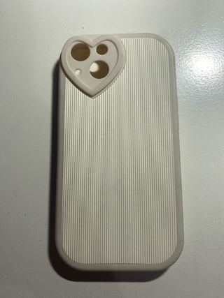 Preciosa funda para iPhone 13, de color blanco roto. Es de silicona y tiene un diseño elegante con líneas verticales. En la parte trasera tiene un hueco con forma de corazón para la cámara. Está en perfecto estado.