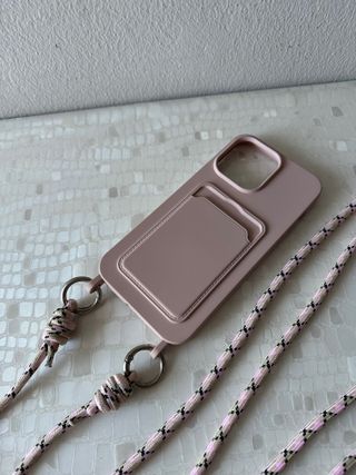Funda para iPhone 14 Pro Max con cuerda ajustable. Protege tu teléfono con estilo y tenlo siempre a mano. - Color rosa palo. - Cuerda de paracord con detalles en rosa y negro. - Cuentas verdes decorativas en la cuerda.