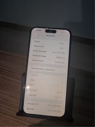 iPhone 14 Pro Max en perfecto estado, listo para un nuevo dueño. Este dispositivo ofrece una experiencia premium con su potente rendimiento y diseño elegante. - Modelo: iPhone 14 Pro Max - Capacidad: 128 GB - Versión de iOS: 26.3.1 - Número de modelo: MQ8R3LL/A - Número de serie: Y937WJ7L60 - Dirección Wi-Fi: 70-31:7F:99:5E:DA - Bluetooth: 70-31:7F:96:79:BC
