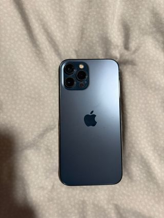 Teléfono móvil iPhone 12 Pro Max en color negro y plata. Un dispositivo elegante y potente. 74% saluda de bateria y un objetivo algo tocado, pero no afecta a la foto. - Pantalla de 6.7 pulgadas. - Chip A14 Bionic. - Sistema de triple cámara profesional.