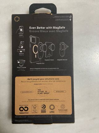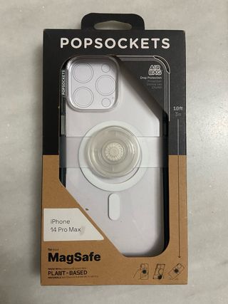 Funda PopSockets para iPhone 14 Pro Max, compatible con MagSafe. Fabricada con materiales de base vegetal. - Protección contra caídas de hasta 10 pies (3m). - Diseño transparente. - Incluye PopGrip integrado.